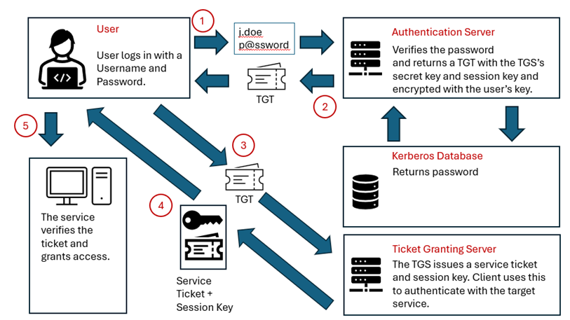 - Ticket-granting server (TGS) – Delivers the service tickets (ST) based on a valid Ticket Granting Ticket (TGT)