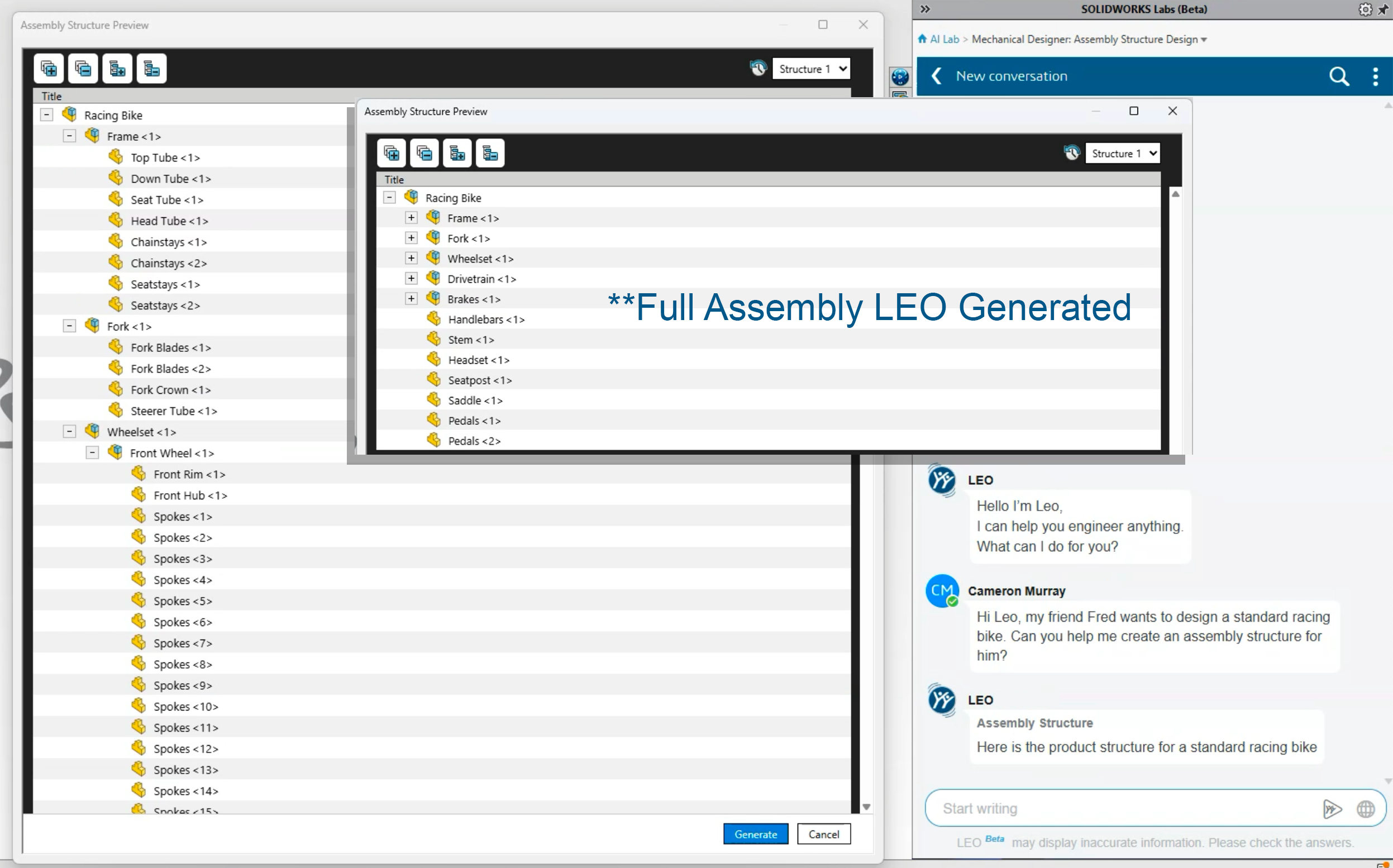In this example, I prompted LEO to create a bicycle assembly structure for my friend Fred. Note, LEO does not design or generate any 3D Geometry within this assembly. The files seen below are essentially placeholders in the overall design. While this sounds simple, this allows you to prompt LEO to generate assemblies for products you are unfamiliar with or do not know the full scope of. This can save time in the research phase of a