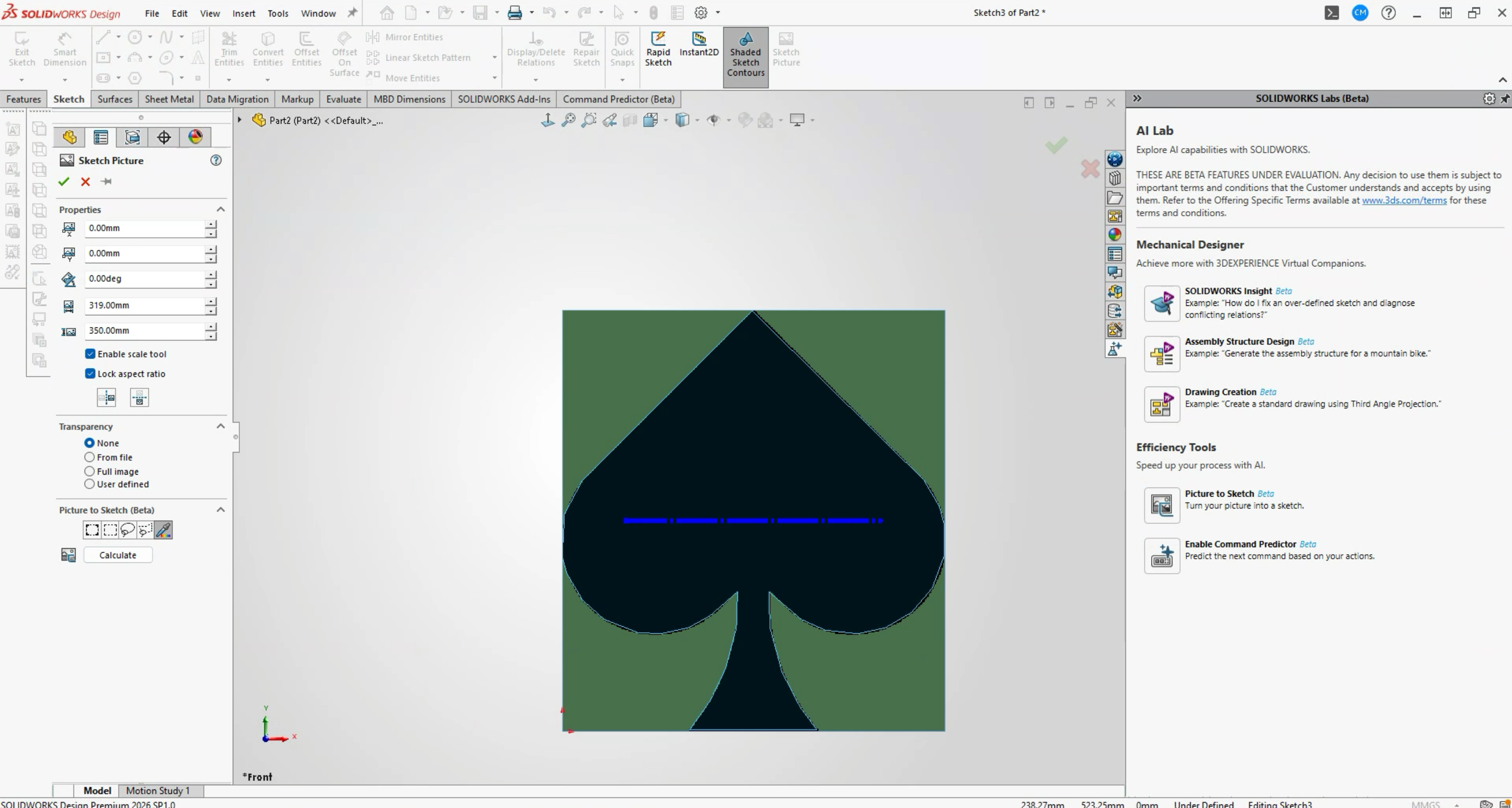 This feature works best with simpler images or a definable color. Here, I selected black with the eyedropper tool under Picture to Sketch when using the Sketch Picture command. If you are having trouble, try to edit or alter your sketch picture before opening it in SOLIDWORKS to get a solid color silouhette of your object.