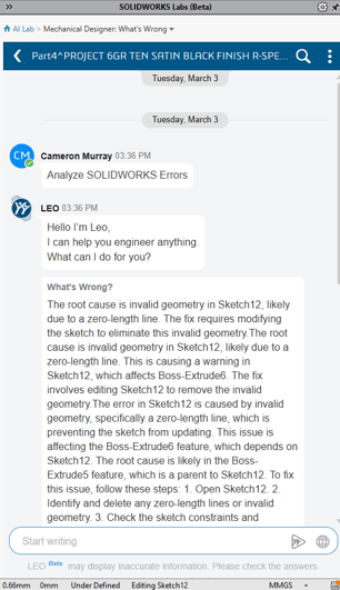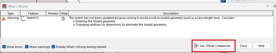 Tired of trial and error with fixing your sketches? LEO has your back! When you rebuild a SOLIDWORKS file like I did here, in your What's Wrong dialogue, you will see a new "Ask Virtual Companion" button next to close and help. This will give you an explanation of what happened to cause a warning. LEO has identified an issue with my Sketch12, so I will click "Ask Virtual Companion" to get a more comprehensive breakdown of the problem.